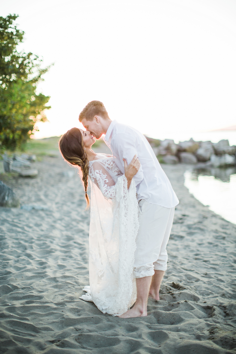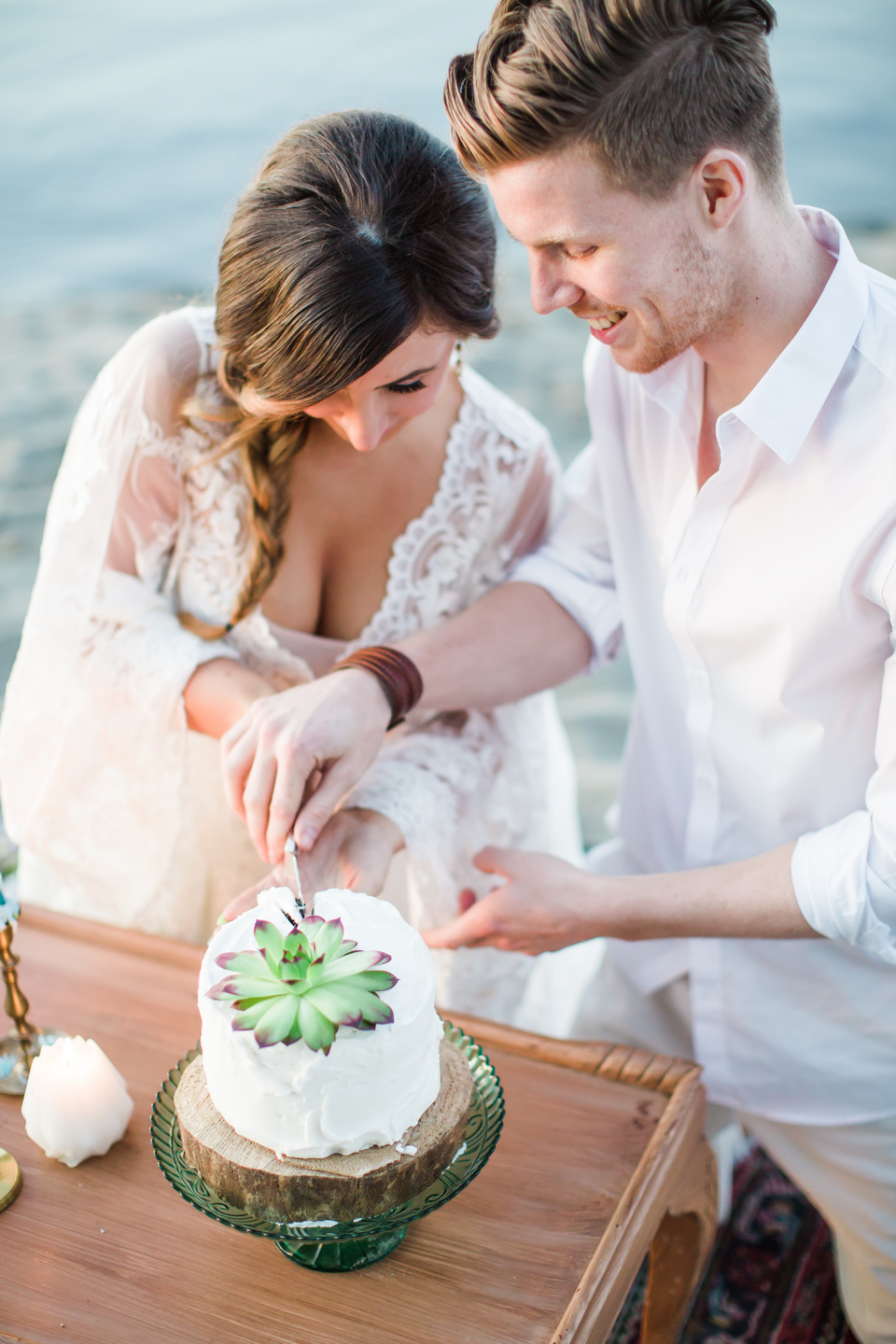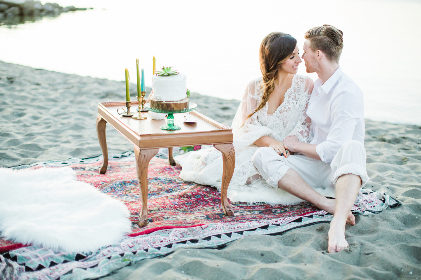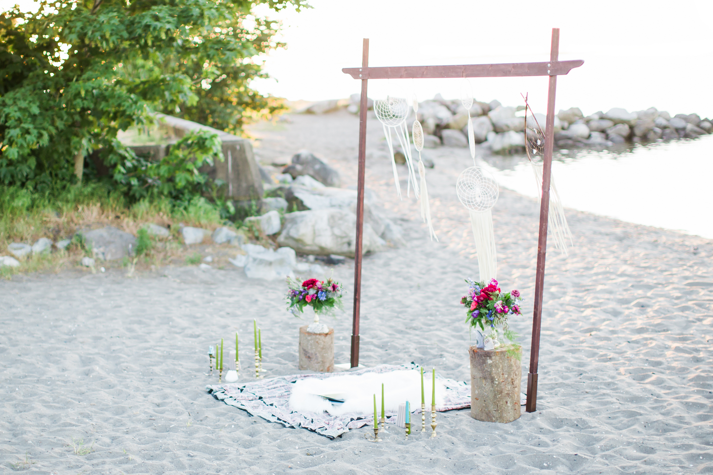 We had such an epic team of amazing Vancouver Wedding Vendors that participated in this shoot! Past Pieces took care of the decor and overall look of the entire shoot. Kick Ass Cakes and The Cake and Giraffe provided amazing mini cakes that were as delicious as they look in the photos! Hand Lettered Love by Bev created the beautiful invitations. The lovely ladies from Save the Date Beauty took care of hair and makeup for our gorgeous model and also provided all the stunning dream catchers we used on the beach! The Main Street Honey Shoppe was kind enough to provide the honey favours for our table setting. Little Pink Dress provided the amazing lacy boho dress for our model, while The Gypsy Heart took care of the accessories! Florals were created by Bridal Beginnings!